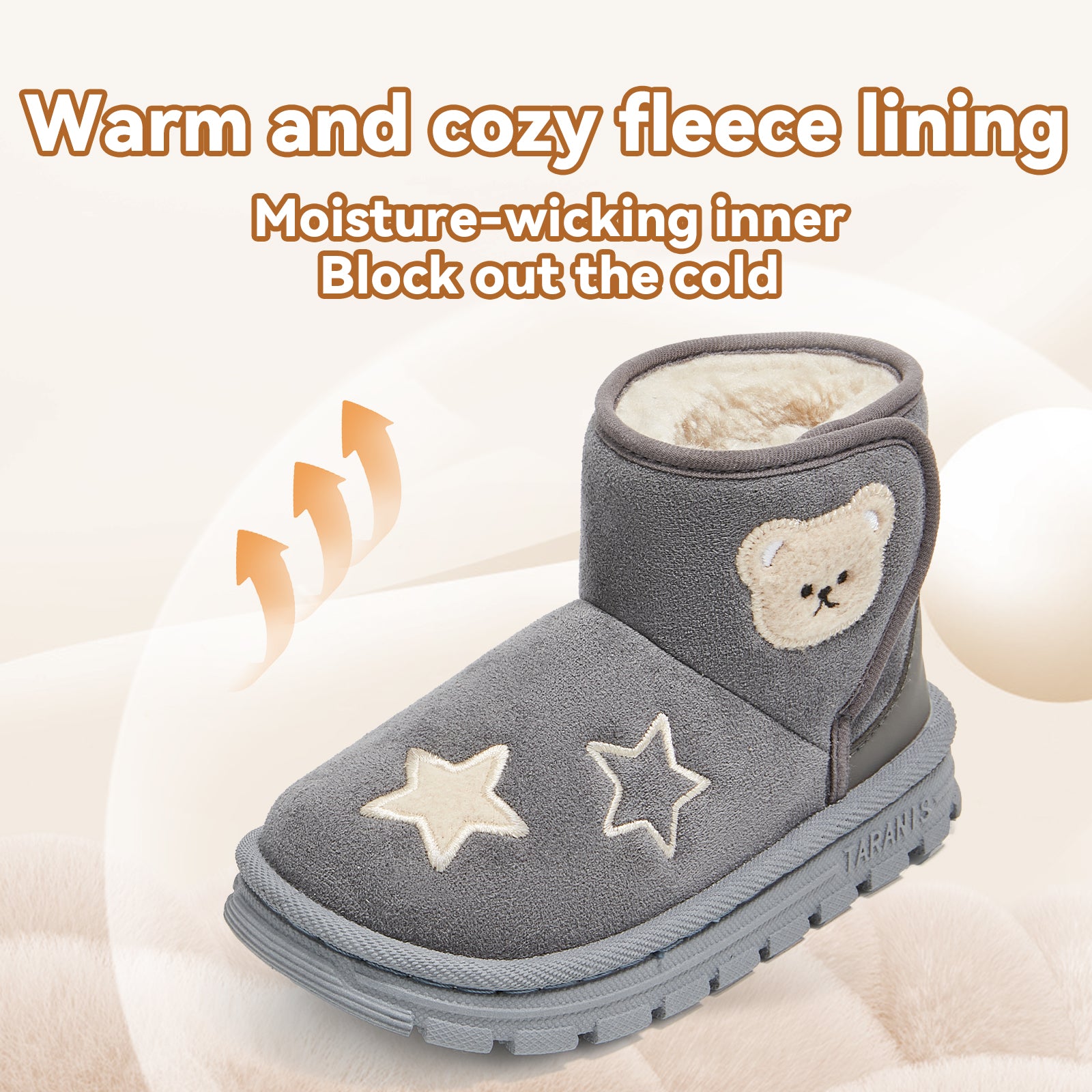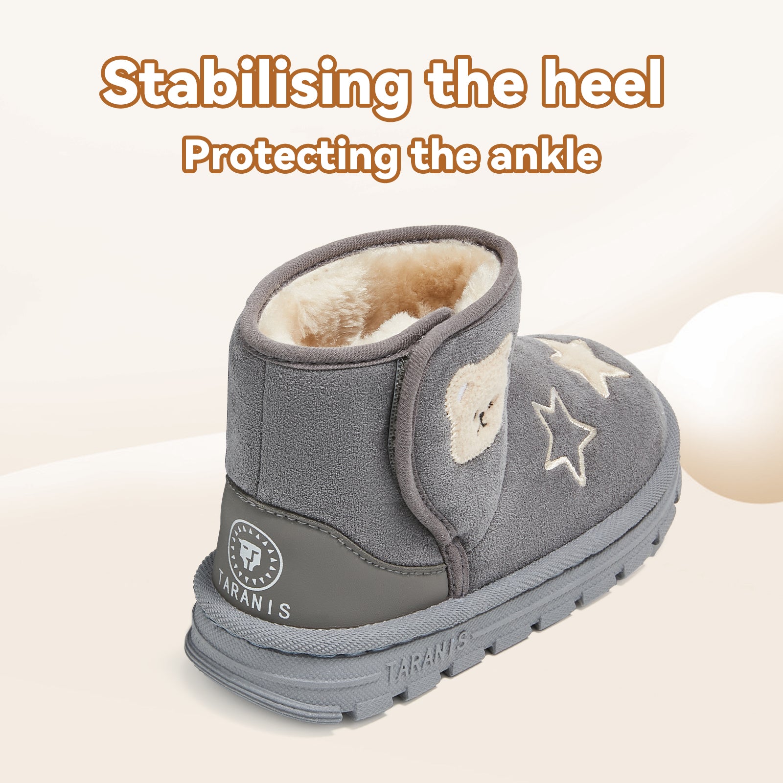 Plush warm lining with memory-foam cushioning, flexible supportive soles, slip-resistant traction, and reinforced toe protection—keeping tiny feet safe, cozy, and confident in every step.