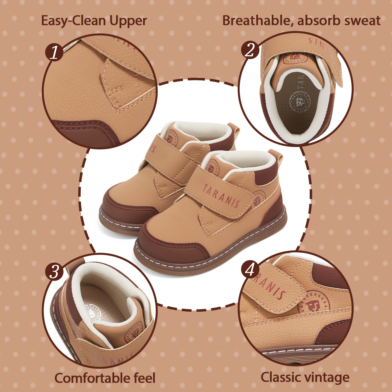 Flexible gait support, ankle stability, eco-friendly cushioned insoles, and easy-clean classic design—keeping little feet safe, comfortable, and confident on every step.